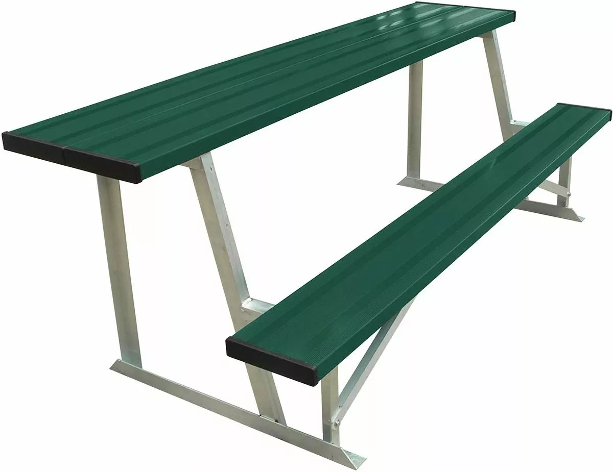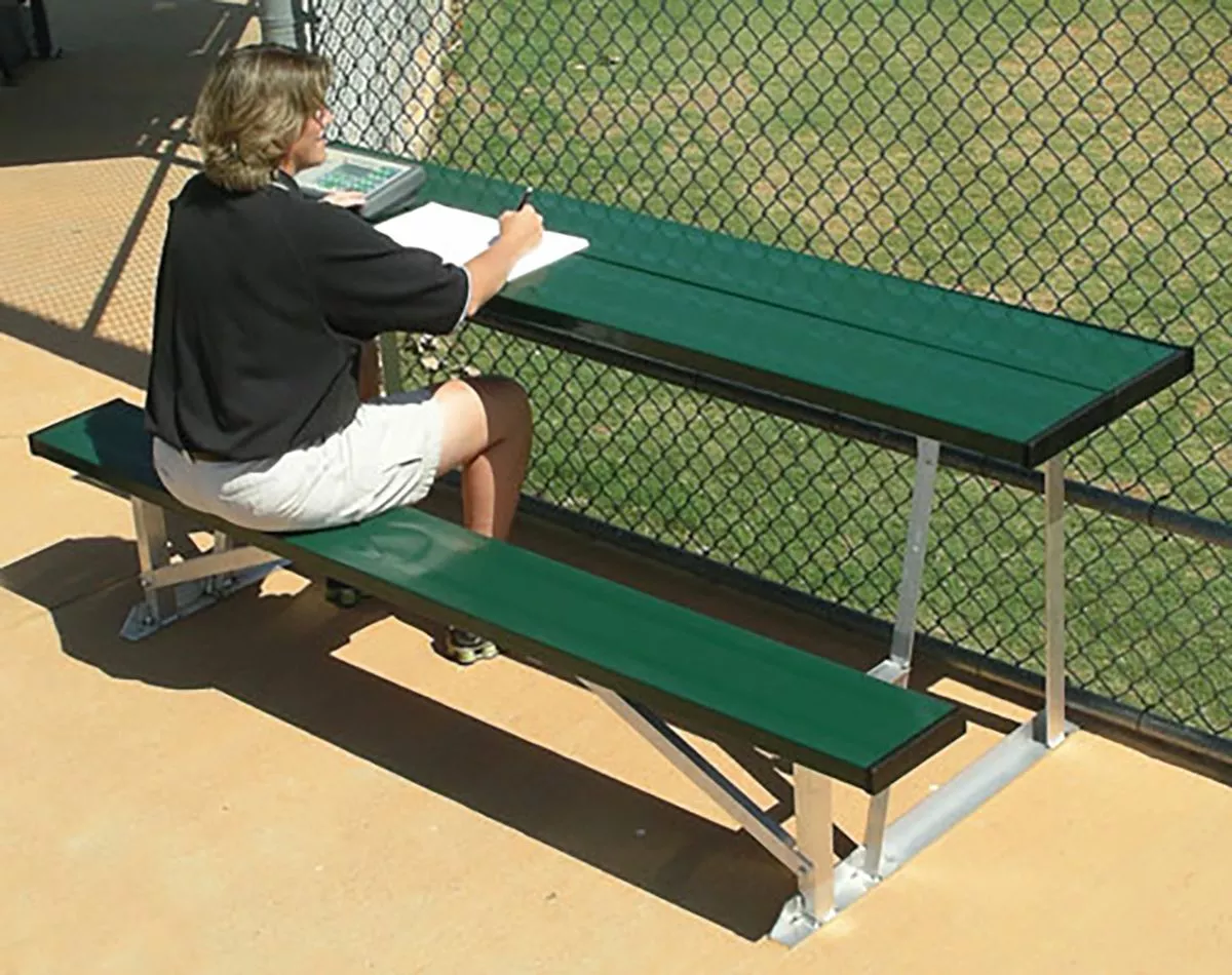 This powder coated outdoor scorer’s table & bench has a unique, all-in-one aluminum design that can be used for any outdoor sport. The portable scorer’s table has a tough, powder coated paint finish that will last for years. The table top is 20″ wide and provides plenty of space for score books, drinks and more. The aluminum seat plank is 5.5′ long and comfortably seats 4-5 people.