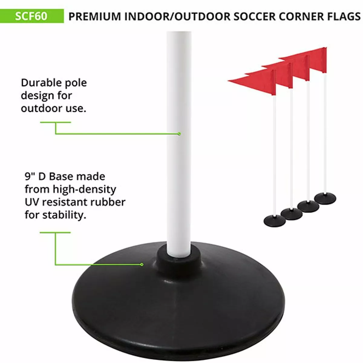 This set of 4 premium turf corner flags is an economical choice that can be used indoors or outdoors and on any playing surface. Each upright sits in a 9″ diameter, high-density rubber base that is weighted for stability.