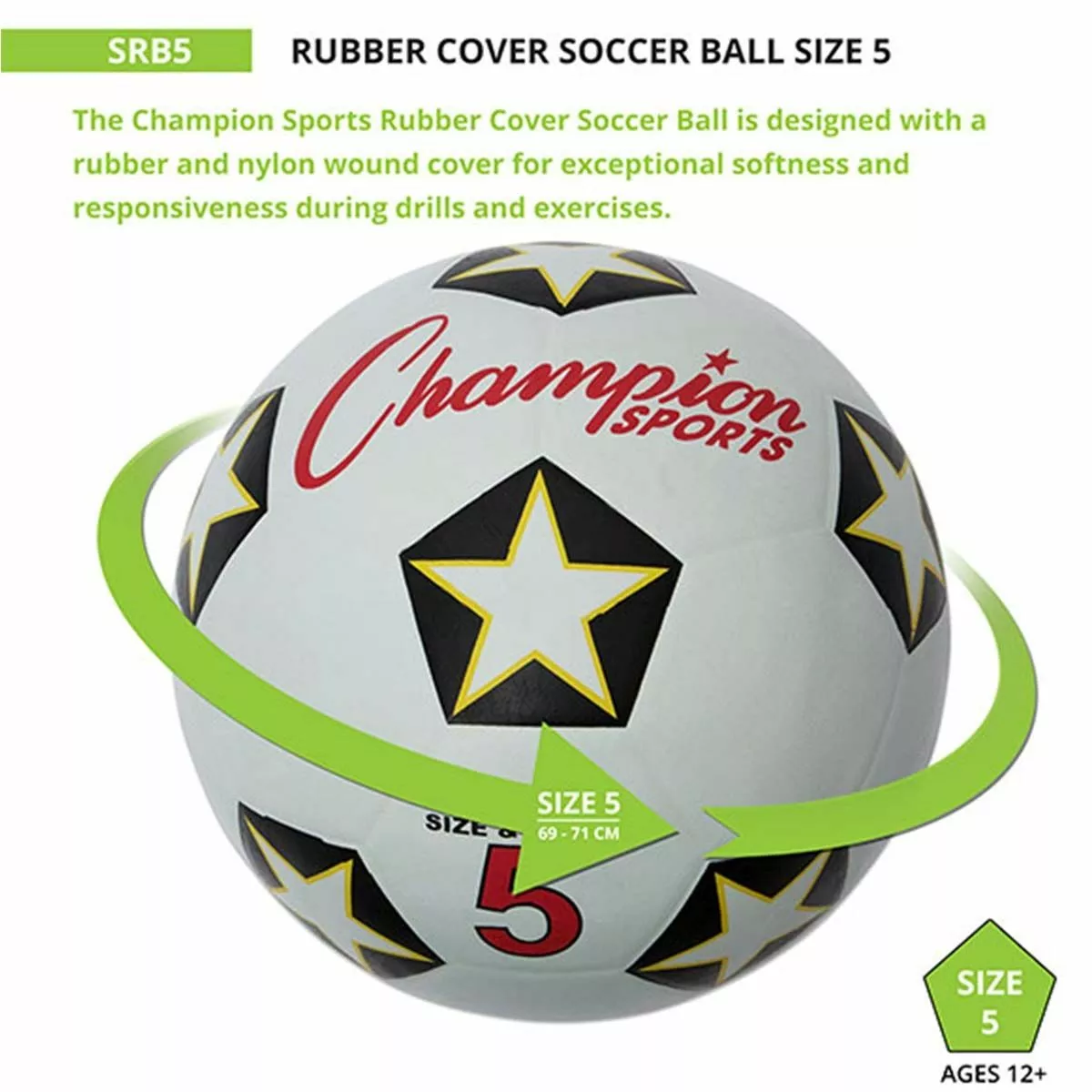 The rubber soccer ball from Champion Sports is perfect for gym classes, indoor recreational leagues, and camps. This soccer ball is equipped with a rubber, nylon-wound cover that is designed to maintain its shape. The 2-ply bladder provides exceptional air retention for less inflating and more playing on indoor or outdoor surfaces. You can get this ball in size 3, 4, or 5. Sizes 4 & 5 are recommended for ages 12 and up, while the size 3 ball is recommended for ages 8 and under.