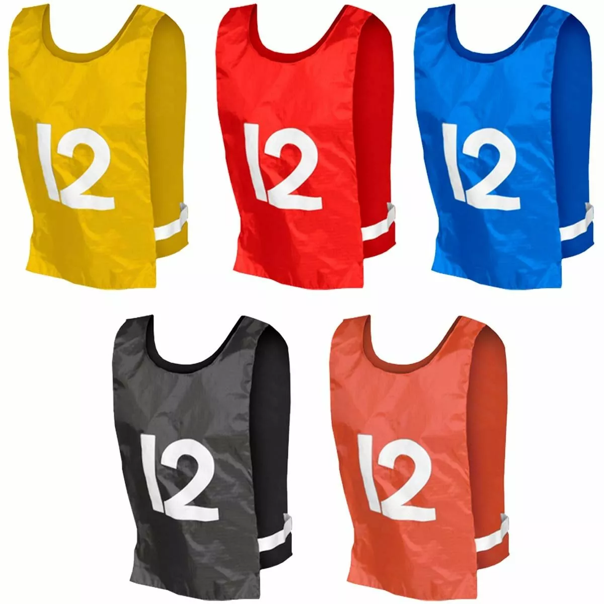 These Champro scrimmage vests are numbered 1-12 on one side only and can be worn for front or back number display. Nylon with elastic waist strap on sides. These adult sized nylon pinnies measure 12″W x 22″L and are sold by the dozen.
