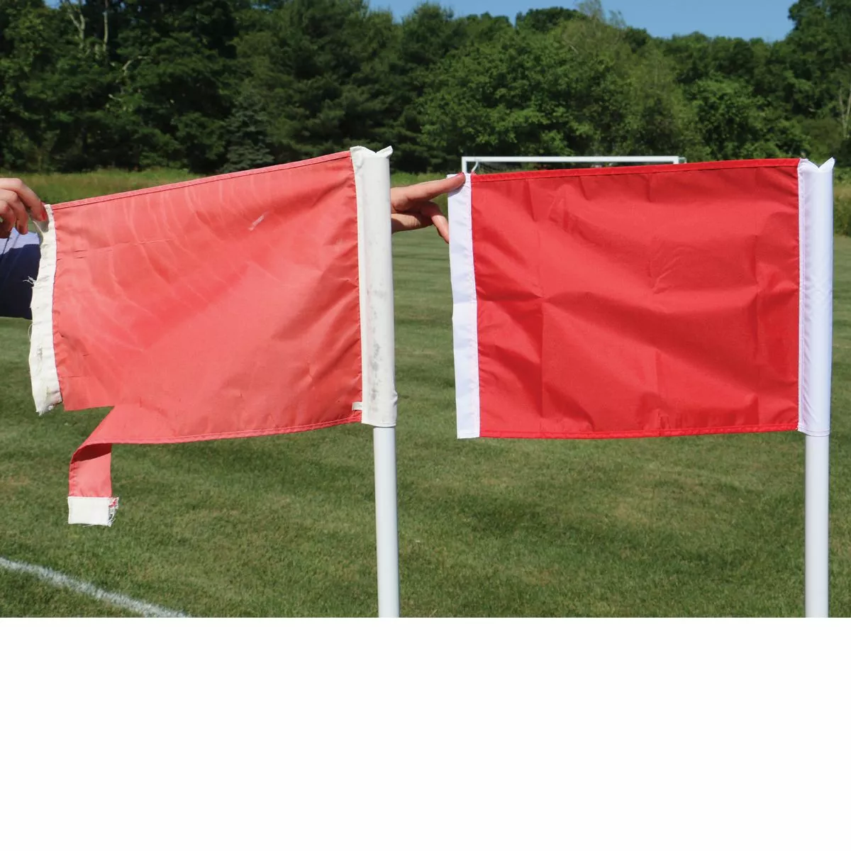 This set of official replacement flags fits all corner flag poles with a 1″ O.D. pole. Simply remove the old, worn-out flag and slide these replacement flags over the top of the pole to give your field a fresh, professional look. If yu want extra security you can use some contact cement to hold the flag in place but typically this is not needed.