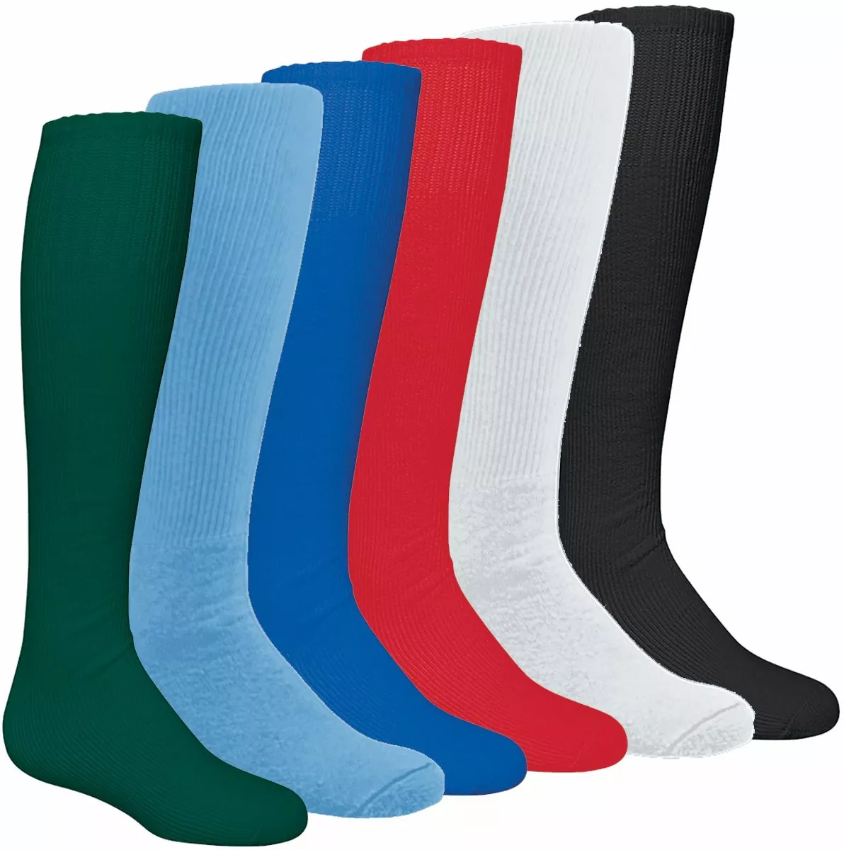 This pair of High Five soccer socks is offered in adult size large, measuring 30″ long. These tube socks feature a blend of 80% acrylic fiber, 14% nylon and 6% elastic – a durable combination that will hold up through cycles of washing and drying and still look great well into next season. With a fully cushioned foot, these knee length athletic socks will keep you comfortable and on your toes. High Five soccer socks are the perfect blend of stretch and comfort that will work for you at every game.