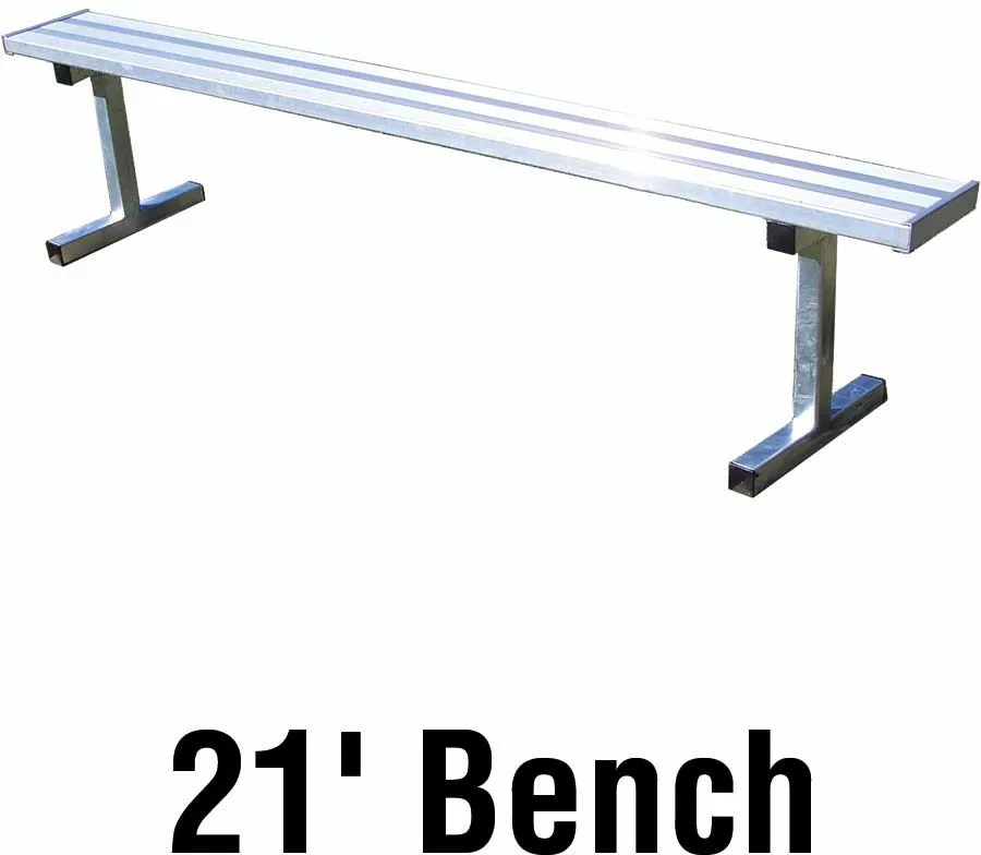 Our 21′ long portable aluminum player bench is constructed of 2” square galvanized steel legs for a strong, stable base and anodized aluminum seat planks. Institutional quality, heavy-duty construction provides years of use for your team or league. All hardware is included and basic assembly is required. Perfect for school fields, parks and sports complexes.