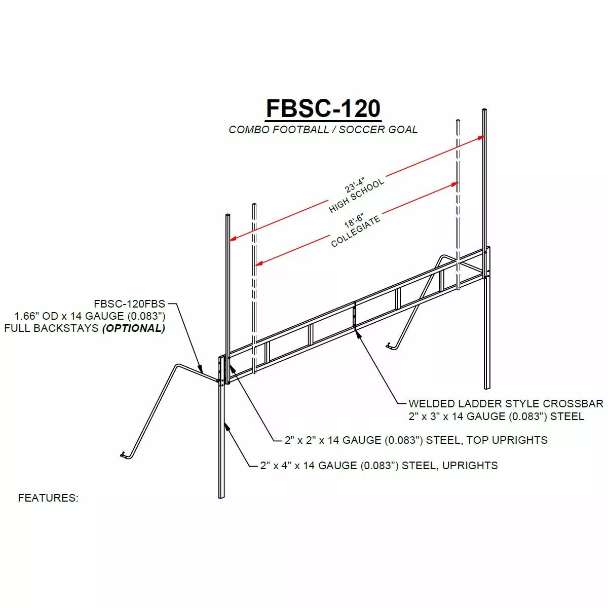 The Jaypro FBSC-120 official soccer/football combo goals are affordable and ideal for multi-purpose facilities where soccer and football events take place. The football uprights can be installed at either high school (23’4″) or collegiate (18’6″) widths, and can be also removed for soccer play. Designed for permanent or semi-permanent installation, this pair of football/soccer combo goals are built with ultra-durable 14 gauge steel tubes, powder coated white over a zinc rich primer. These goals are NFHS and NCAA certified and are backed by a 3-year limited warranty. See “Additional Info” tab for specifications/drawings and installation instructions.