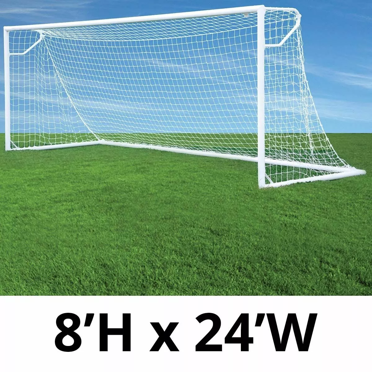 This pair of official size 8×24 Jaypro Nova Club goals are all aluminum, portable club goals that feature a full ground base frame with an Easy Track net attachment system for complete net attachment. Nova club goals have a European backstay plus auxiliary backstay for added goal support and stability. The 3″ O.D. round extruded aluminum goal face and base includes the Jaypro Easy Track channel for secure, easy net attachment. The backstays are 1-5/16″ round, heavy-walled aluminum tubing and the entire goal is powder coated white. The all aluminum Nova Club Goals are lightweight and easy to move, yet rugged enough for the most demanding environment.