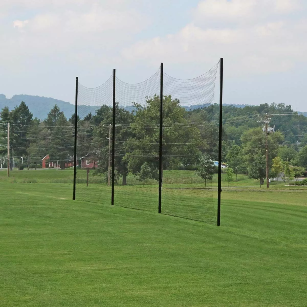 The Kwik Goal multi-sport backstop net system has a smaller 1-3/4″ mesh that will stop smaller sport balls like lacrosse and field hockey in addition to soccer balls. A hoist system makes it easy to put up and take down the net. As a backstop the suggested distance behind the goal is 25′ and you can also line them up end-to-end to create barrier netting in between fields. The entire Kwik Goal system is approved for up to 80 mph winds and can be installed either permanently or semi-permanently with the ground sleeves.