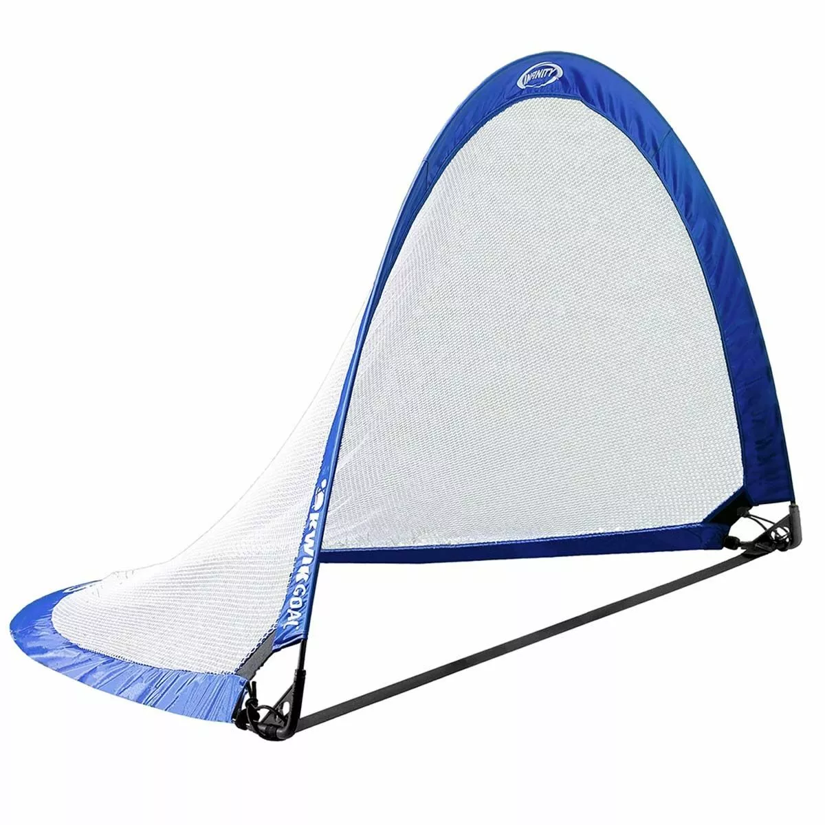 The Kwik Goal Infinity pop-up goal quickly folds for storage. Lightweight and easy to carry. Great for pick-up games and scrimmages. Poly/steel frame construction with gusseted nylon corners and three nylon anchor pegs for stabilization. Includes a polyester carry bag, elastic anchor tethers and Velcro® fasteners that hold the goal in a folded position.
