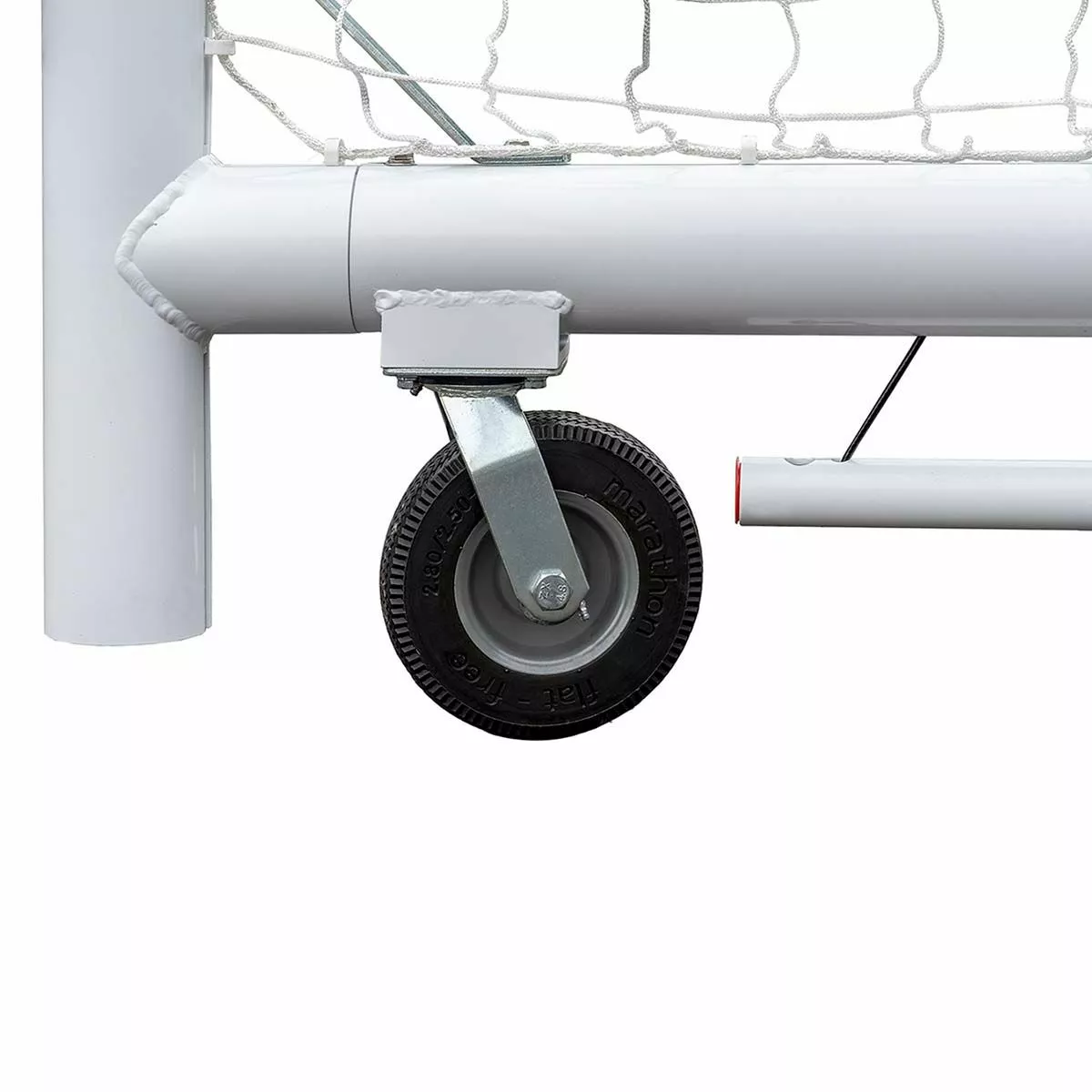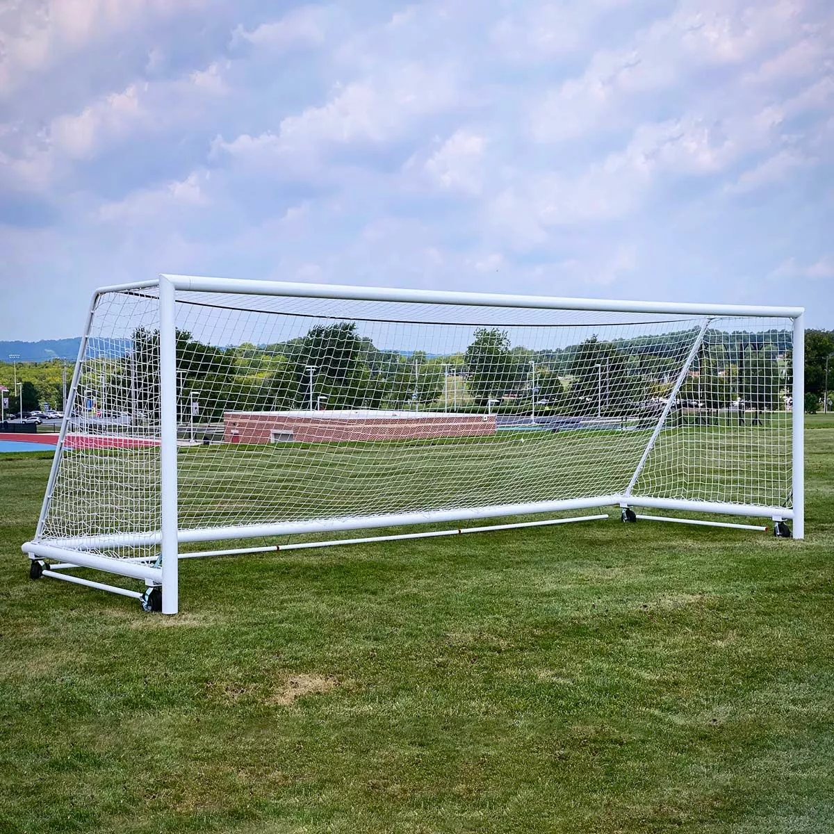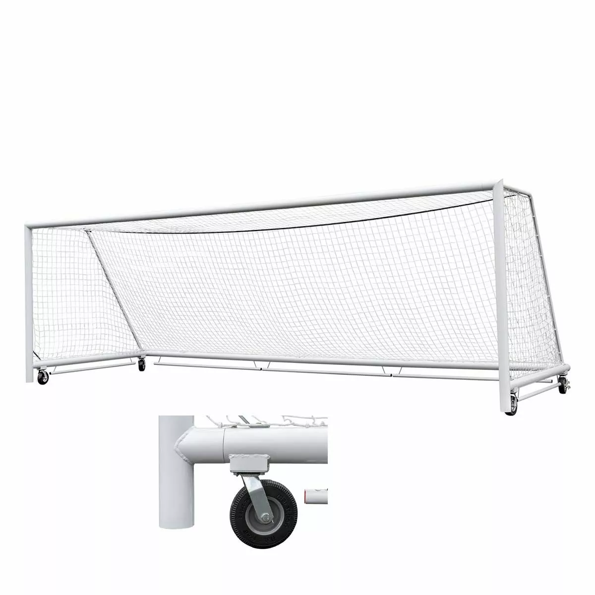 The Kwik Goal Evolution Prime soccer goal is the perfect goal for moving around the training grounds or positioning for a match under the lights. 4 permanently mounted swivel wheels allow the goal to move freely around any surface when not anchored with the semi-permanent ground anchors. The 4 3/8” round aluminum post is painted with a white powder coat for a durable and weather-proof finish. The included 3mm, 120mm white net is easily secured with Kwik Lock® net clips that go into the system around the entire frame. A revolutionary bumper system surrounds the bottom of the frame ensuring balls stay inside the goal at all times. The Evolution Prime soccer goal exceeds NCAA, NFHS, and ASTM F2950-14 standards ensuring that it is playable for all levels. See “Additional Info” tab for installation instructions.