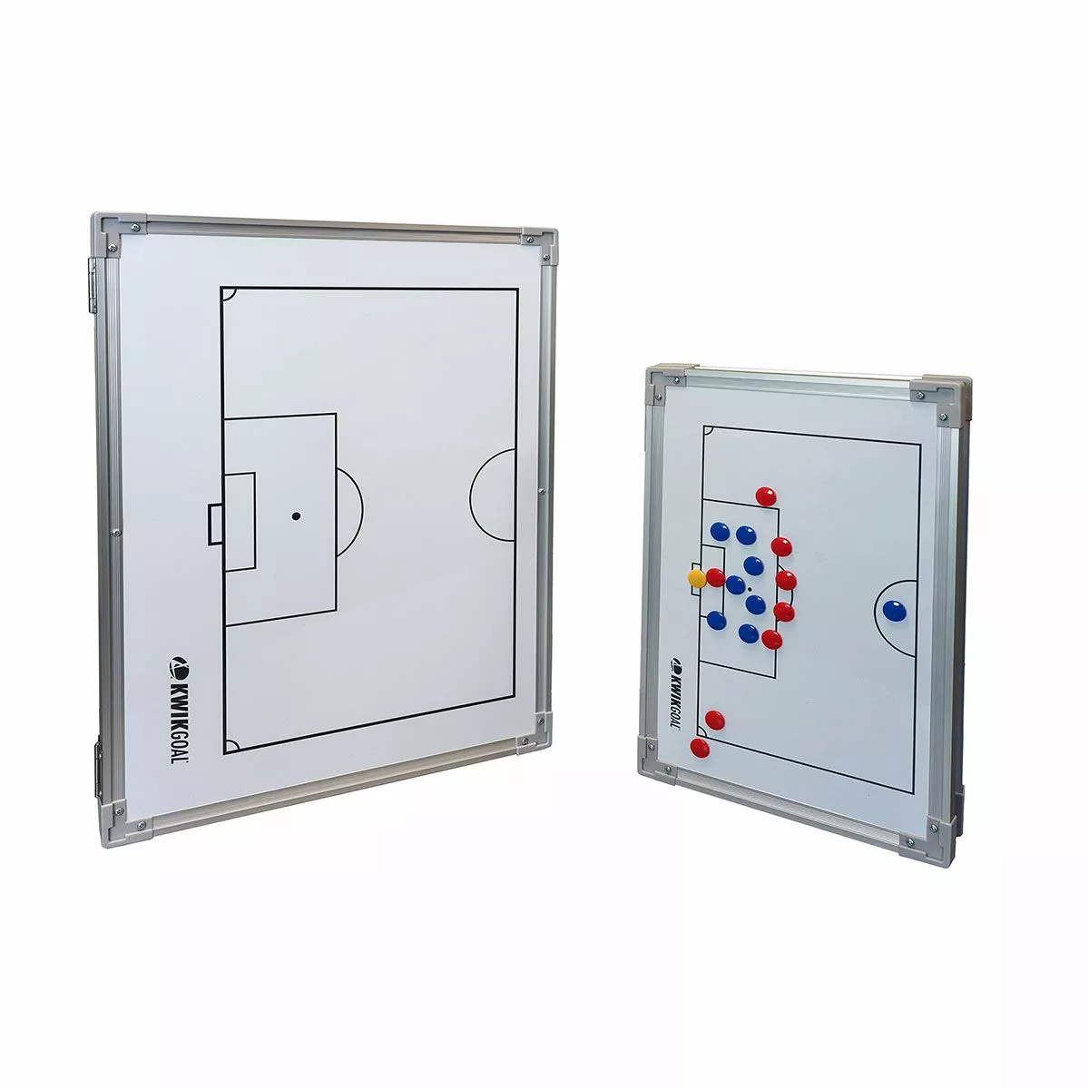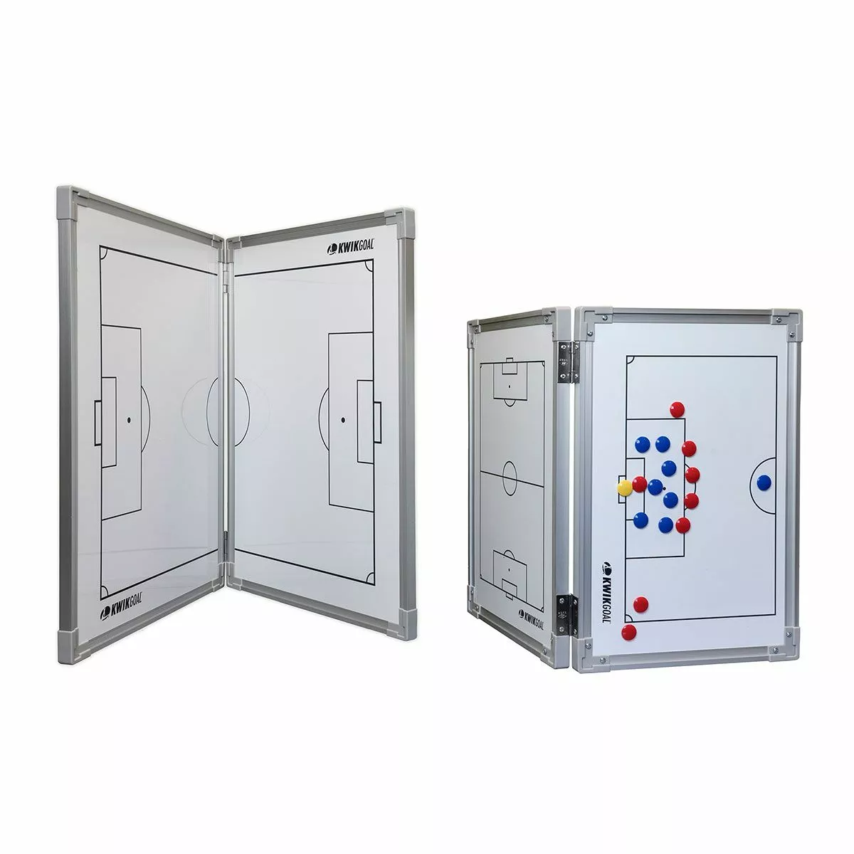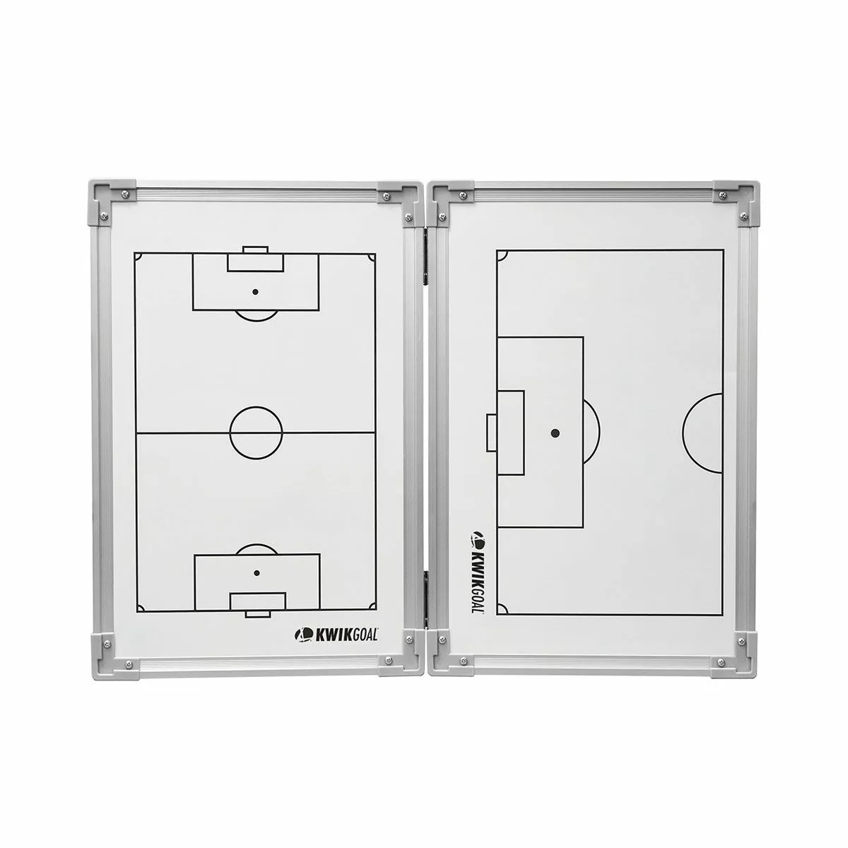 Kwik Goal’s folding magnetic soccer coaching board comes in two sizes and is the perfect board to deliver game plans and tactics, offering multiple surfaces and contains several field layouts. The coaching board can be folded in half for an in zone focus and comes equipped with an eraser, two markers, a carry bag, and 27 magnets.