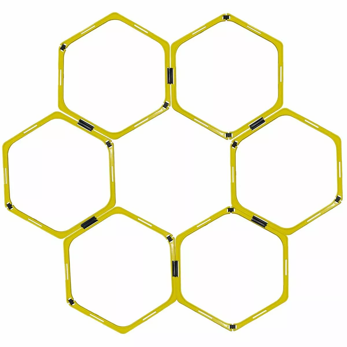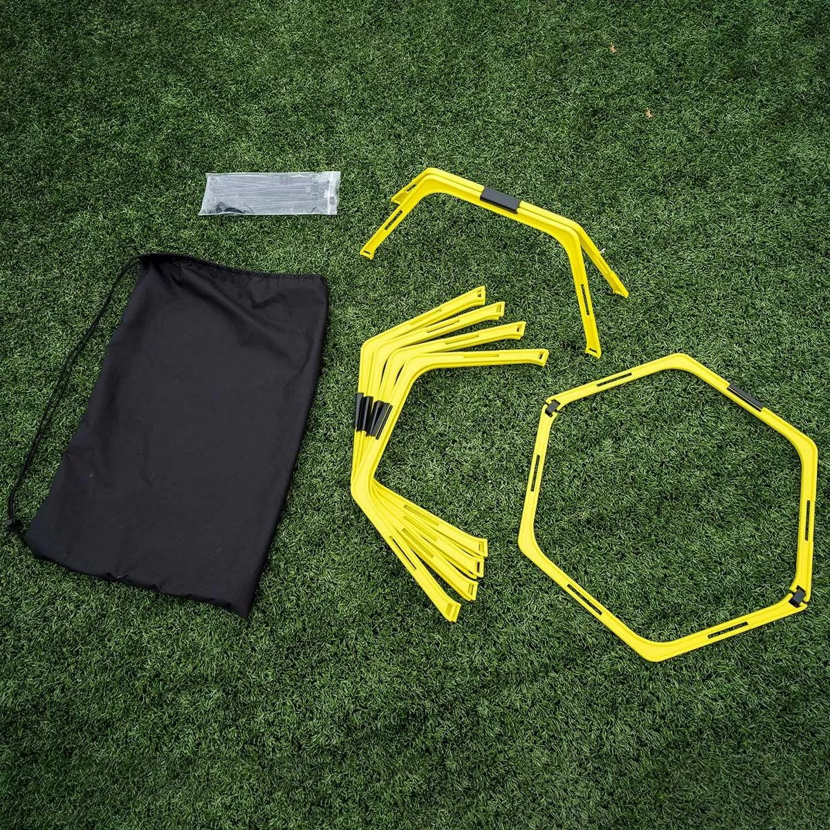 The Kwik Goal Hex speed rings set is a multi-purpose speed and agility training tool designed to improve footwork and explosive movement on the field. This versatile training aid can be configured as speed rings, 9″ hurdles, and as an agility ladder giving you access to multiple exercises and saving space in your coaching bag. The set includes 6 hexagonal rings, connecting clips, hurdle bars, and a carry bag. The rings are built with high impact PVC that is durable for use on any surface. To build a hex ring, connect two half rings with the small connector clips. Use the large connector clips to connect multiple hex rings to create your own speed and agility course. The long connector clips also give the option to use a 9” hurdle.