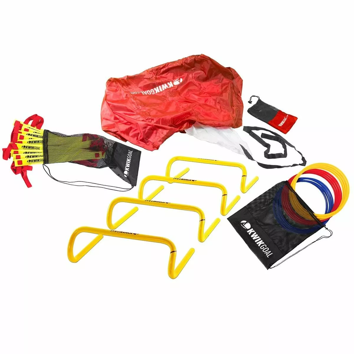 Increase speed, strength, and agility with the Kwik Goal Player Speed kit that includes: agility ladder, 12 speed rings, 4 speed hurdles, and a resistance chute. This economical kit includes a ladder, speed rings, speed hurdles and a resistance chute.