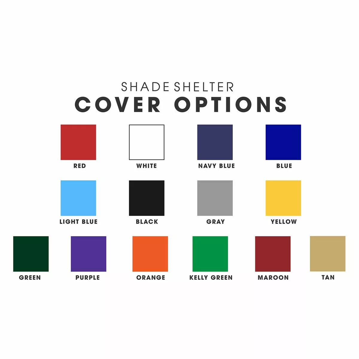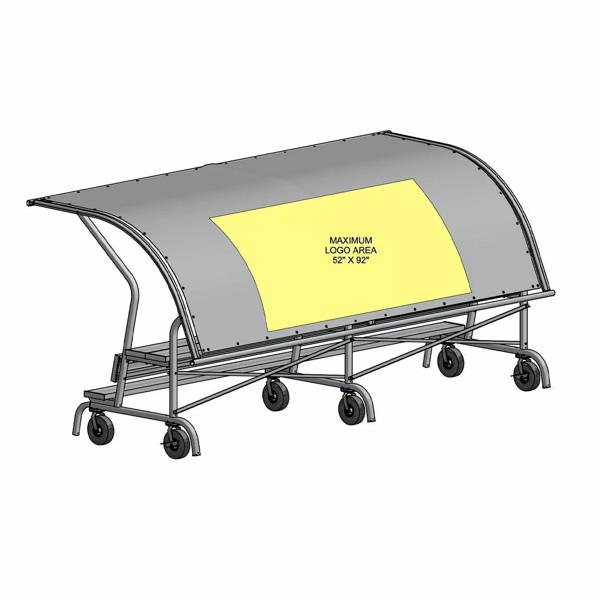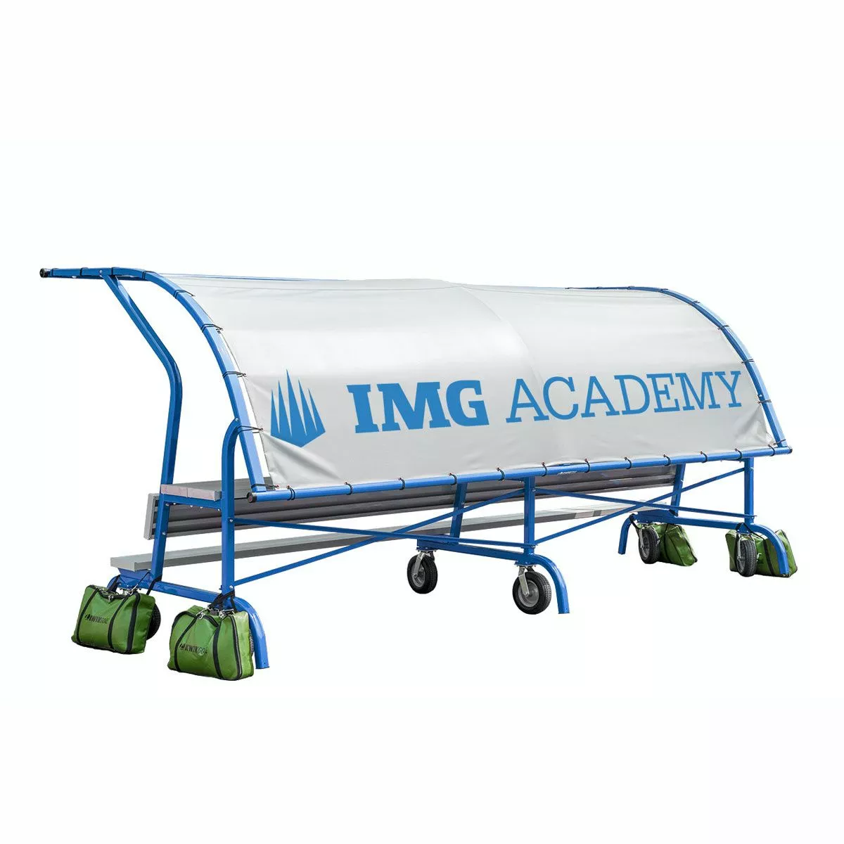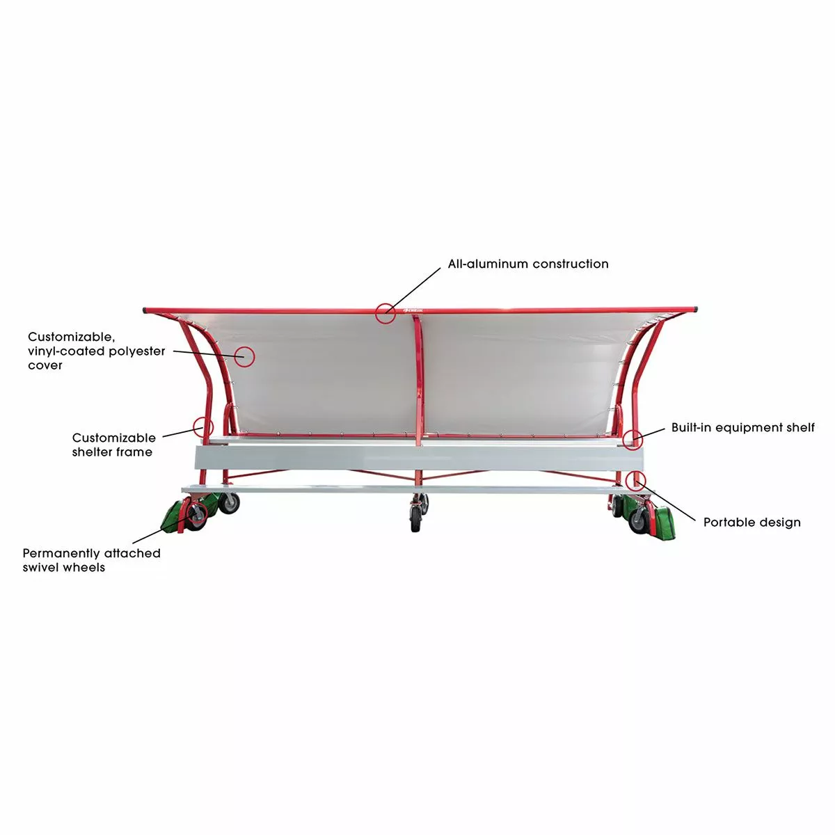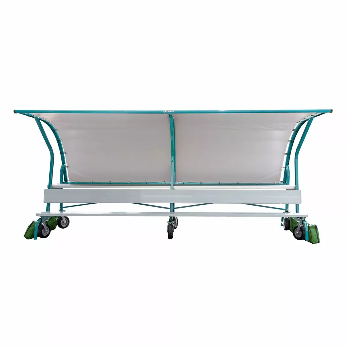 The Kwik Goal portable team shade shelter is perfect for schools and clubs that are looking for a shelter with portability and customizability. Featuring a durable, all-aluminum frame and a vinyl-coated, polyester cover, the shade shelter will help keep your players safe from damaging UV rays during a match. With no-flat swivel wheels, which are permanently mounted to the frame, the entire shelter can be easily transported around your facility and stay in place with the included anchor bags. This sideline seating option also includes a built-in equipment shelf to help reduce clutter and keep your sideline organized. The customizable vinyl cover attaches to the front of the frame with clips for a clean look while the side and back attach with bungees for a snug fit. See “Additional Info” tab for installation instructions and specifications.