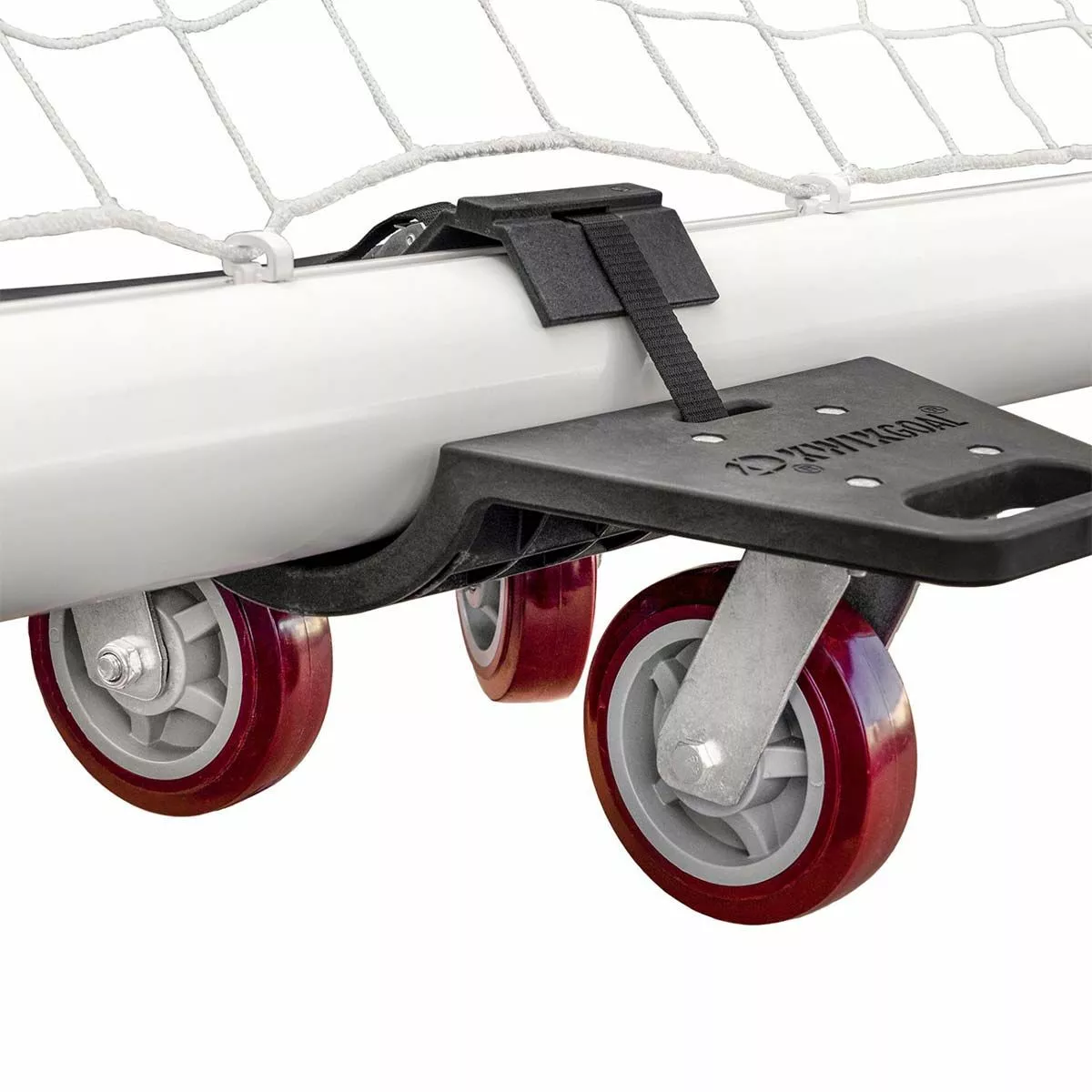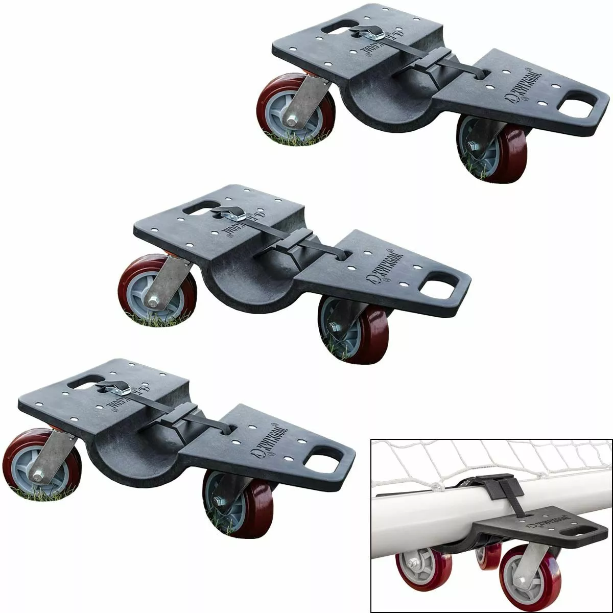 The Kwik Goal soccer goal dollies make transporting any goal with round posts a breeze. The easy strap attachment make it easy to secure the bottom of the frame to the dolly before moving the goal to the desired location. Carrying handles on each dolly assist in moving them in and out of storage. Constructed out of a nylon plastic plate and equipped with polyurethane/steel wheels, these dollies are heavy duty and built to last. See “Additional Info” tab for installation instructions.
