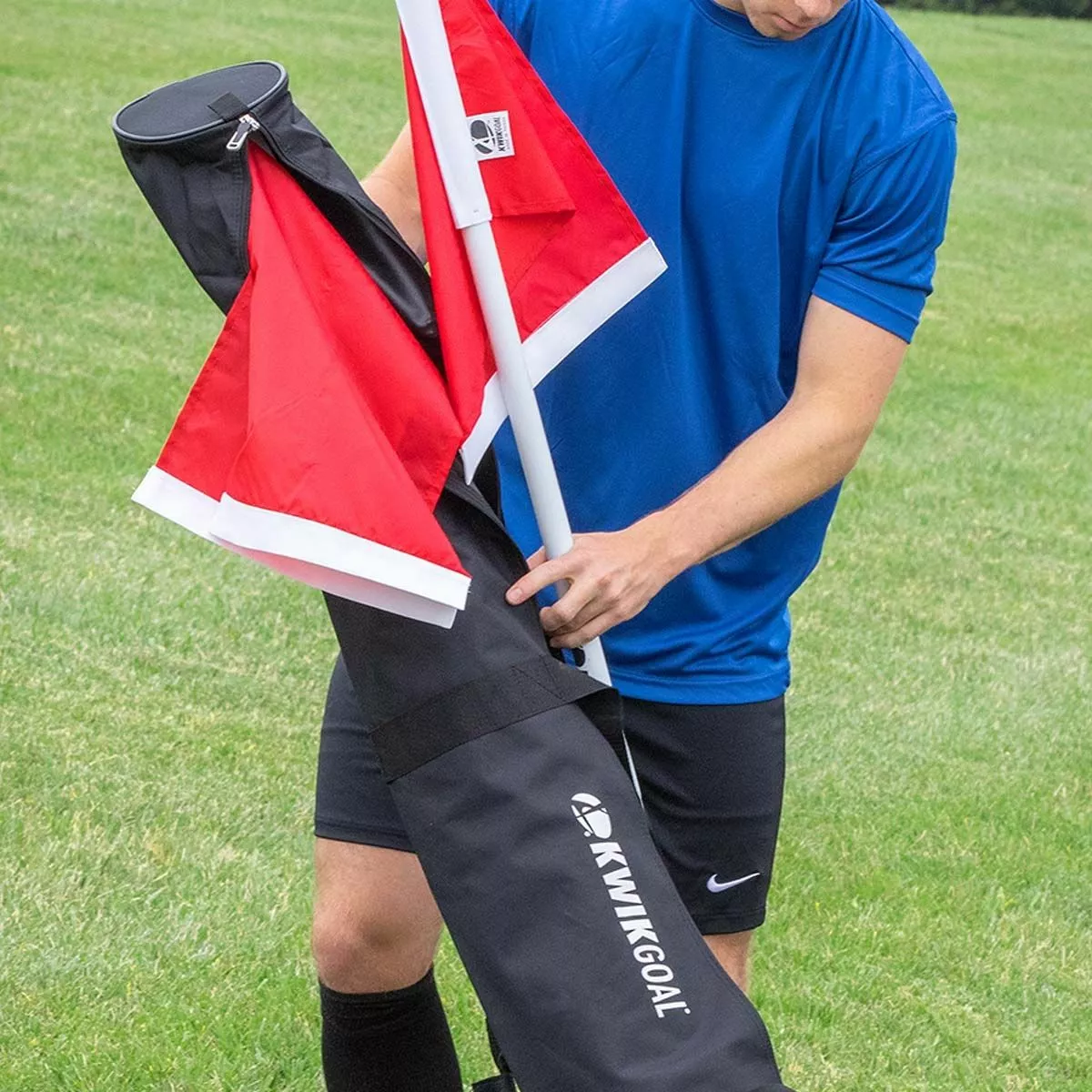 The Kwik Goal Corner Flag Carry Bag is made of heavy-duty vinyl and holds 4 corner flags, coaching sticks, or obstacle markers. Carry your flags and sticks comfortably and securely with the built in strap. Like all Kwik Goal products, the Corner Flag Carry Bag is backed by Kwik Goal’s lifetime guarantee.
