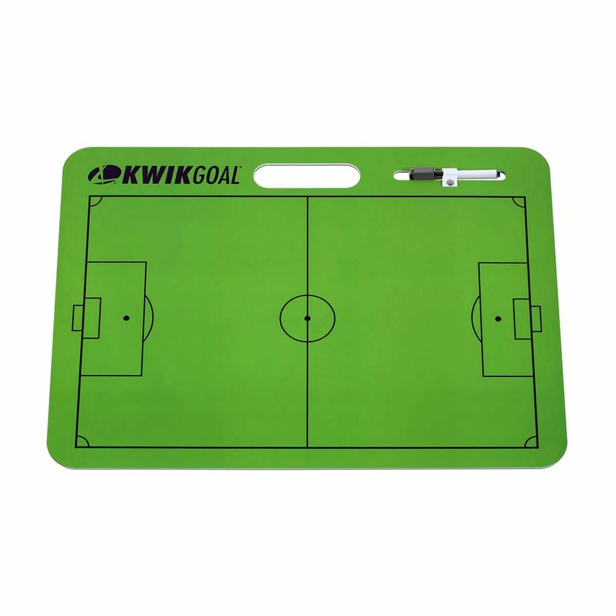 The Kwik Carry dry erase soccer coaching board from Kwik Goal is a clean and simple tool for coaches to help players visualize on-field formations and game plans. The large green board features a full field diagram on the front side and a 1/3 field diagram on the back, which can both be written on and erased with the included dry erase marker and eraser. The built in handle makes it easy to carry on and off the field between halves or training sessions.