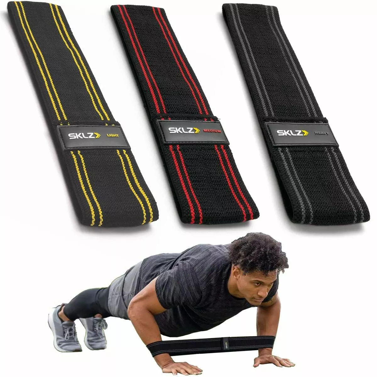 Improve your mobility and strength for both your upper and lower body with pro knit resistance bands by SKLZ. These bands are constructed of strong, durable fabric and are offered in light medium and heavy resistances to enhance your training. The comfortable fabric stays in place during training and won’t pinch or pull your skin. Besides being great for workouts, these bands can also be used to add resistance during warmups and stretching. For lower body training, wear the bands around the ankles for longer stride movements that activate glutes and hamstrings to prepare for squats, lunges, or running. For upper body work, place the bands around the wrists for shoulder activation to warm up for movements like pull ups, push-ups, and overhead weights. After sweaty workouts, the bands are machine washable and easy to clean.